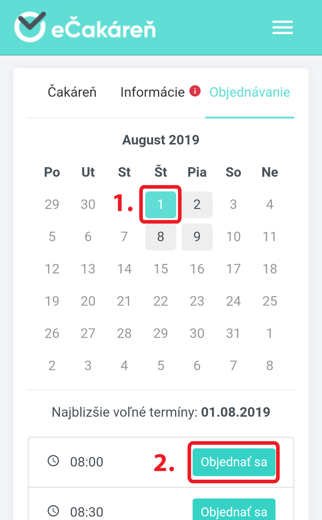 Kliknite na sekciu objednávanie a vyberte si termín, ktorý Vám najviac vyhovuje.